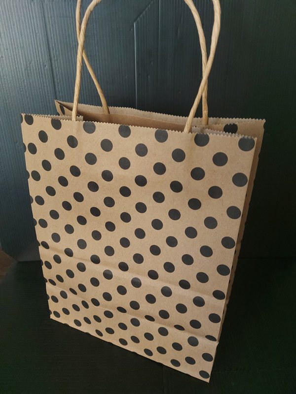 Dárková taška hnědá s černými puntíky a krouceným uchem