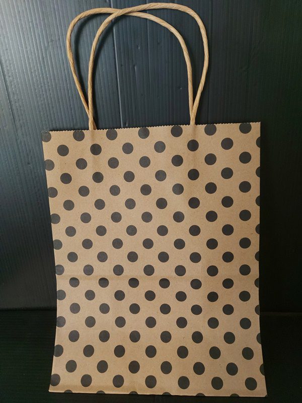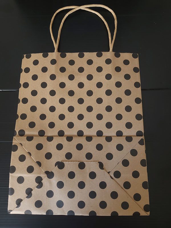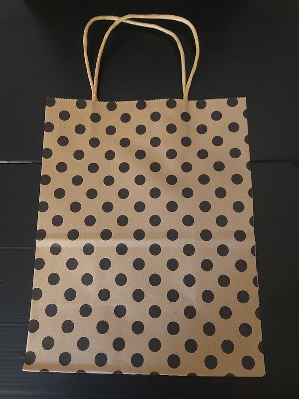 Stylová dárková taška v hnědé barvě s černými puntíky a pevnými kroucenými uchy je ideální pro celoroční balení dárků pro rodinu, přátele i kolegy. Díky přírodnímu designu se skvěle hodí pro minimalistické, rustikální i elegantní dárkové balení.