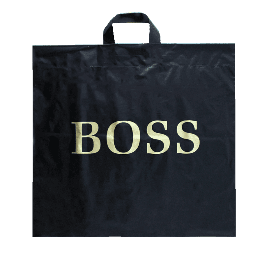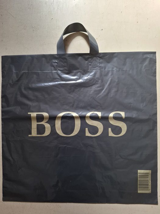 Stylová a pevná igelitová taška černé barvy se zlatým nápisem BOSS o rozměru 50×50 cm je ideální pro odnos nákupů, oblečení nebo jiných předmětů. Díky pevnému materiálu s uchem zvládne i těžší obsah. Je vyrobena z recyklovaného plastu, což z ní činí praktickou i ekologicky šetrnější volbu.