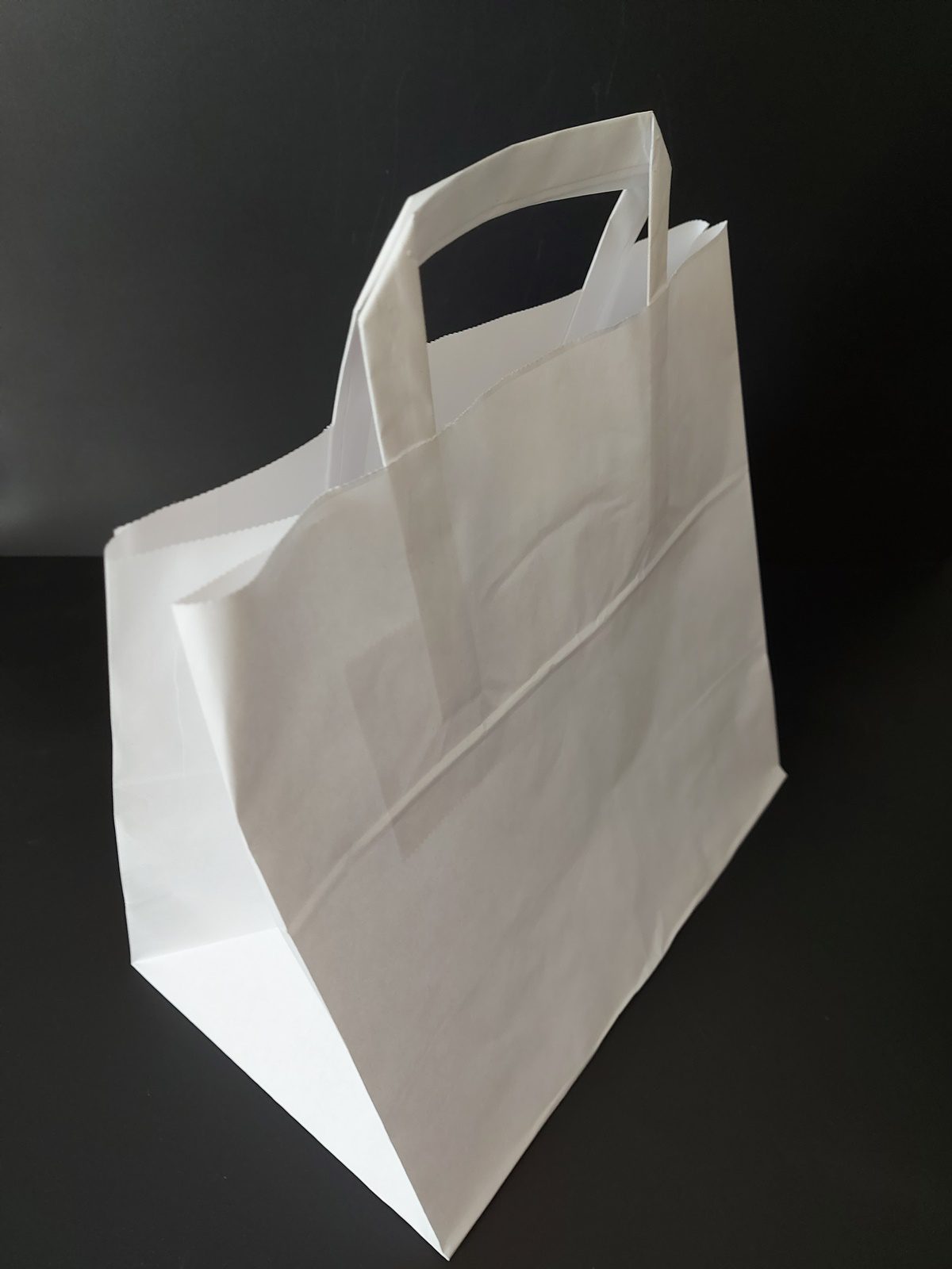 Papírová taška v bílé barvě s plochým uchem a rozměry 260 + 170 × 250 mm je ideální pro přenášení lehčího zboží, jako je textil, galanterie, kosmetika, drogerie, pečivo, ovoce a zelenina. Díky praktickému tvaru a skladnému provedení je vhodná pro maloobchody, pekařství, farmářské trhy i rychlý prodej s sebou.